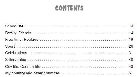 Содержание текстов отвечает интересам учащихся данной возрастной группы. Так, например, учащиеся узнают, как их британские и американские сверстники проводят свободное время, об их увлечениях и хобби (from Hit and Run by D. Anastasio, The Older Boy by F. Pascal), о том, какие мероприятия проводятся в их школах (from Ellen Tebbits by B. Clearly, Harriet the Spy by L.Fitzhugh), о правилах безопасности, принятых в их семьях и школах (from The Computer Nut by Betsy Byars, Matilda by Roald Dahl), о жизни школьников в британской школе-интернате (from The Adventures of Jennings by Anthony Buckeridge), о популярных праздниках и традициях (from The Perfect Tree by Debra W. Hingley, An Old-fashioned Thanksgiving by Loise May Alcott). Они также читают о достопримечательностях Великобритании, сказки, стихотворения и т.д.