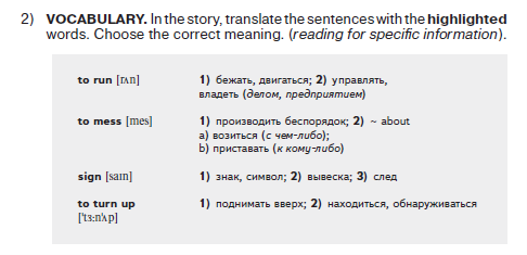 В Книге для чтения предлагаются также упражнения, направленные на совершенствование лексических и грамматических навыков чтения. Они помещены под рубриками Vocabulary и Grammar.