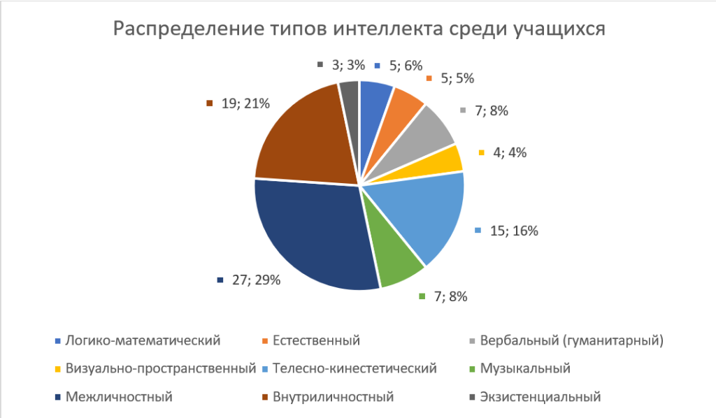 Ребята с преобладающим пространственно-художественным интеллектом демонстрировали радость от освоения новых техник в рисовании, участия в выставках, знакомства с новыми для них направлениями в изобразительном искусстве: «Теперь я могу рисовать в реалистичном стиле», «в этом году состоялась моя персональная выставка…». Данный тип интеллекта выявлялся в высказываниях, относящихся к различным творческим (не только художественному) занятиям: музыкальная школа, танцевальный кружок и т.п. Учащиеся с выраженным логико-математическим интеллектом ограничивались перечислением успехов в учёбе, а также участием в олимпиадах по математике. Их внешкольные интересы связаны, в первую очередь, с программированием, математикой и конструированием: «Я разобрался в нескольких компьютерных программах», «Мне было интересно решать задачи, особенно на проценты…».