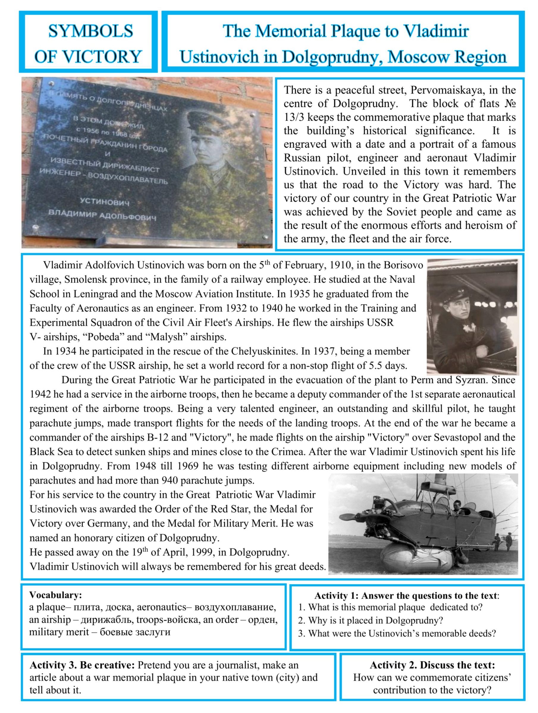 THE MEMORIAL PLAQUE TO VLADIMIR USTINOVICH IN DOLGOPRUDNY, MOSCOW REGION